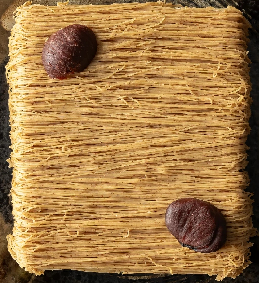 - 和栗クリーム・生羊羹・ティラミス層の三層構造で一つで三つの味が楽しめる
